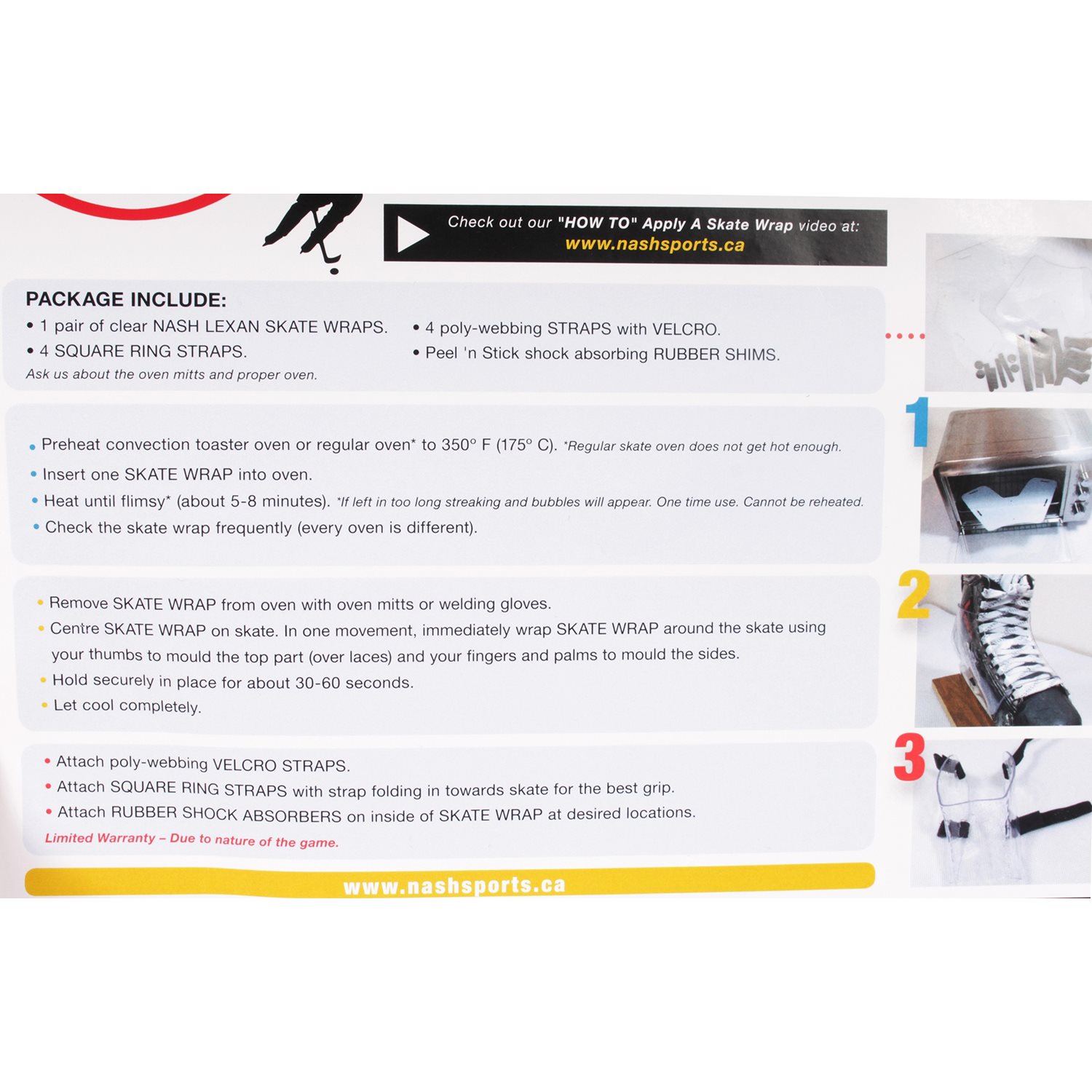 Varm opp Nash Skate Wrap Pro i ovn (175 grader) i 5-8 minutter. Bruk Hockeyhansker når du tar Skate Wraps ut av ovnen.