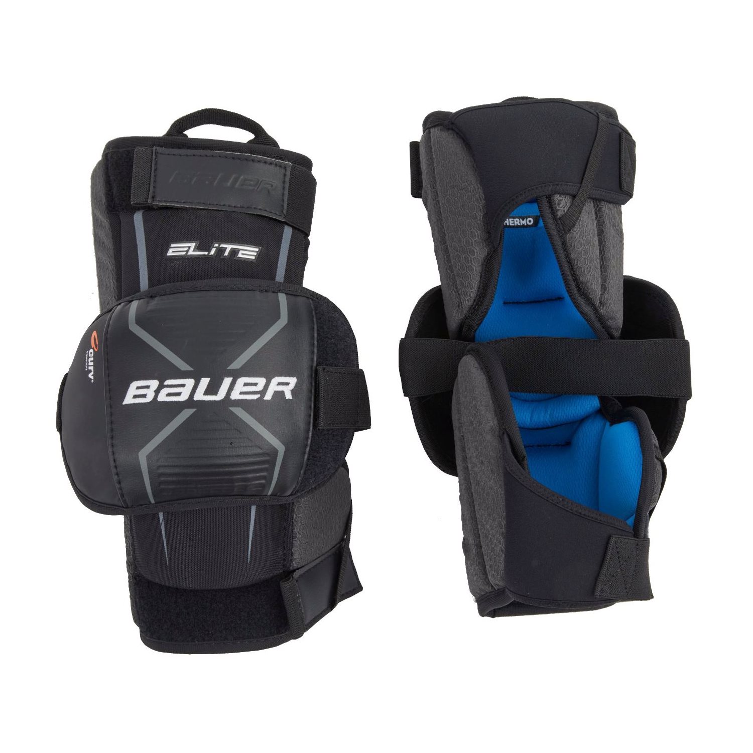 Bauer knebeskyttere for målvakter som fokuserer på mobilitet med en ny ergonomisk kneskål. CURV-kompositten garanterer utmerket beskyttelse og forbedrer passformen. THERMOMAX + innerfôr forhindrer oppkomsten av bakterier og holder spilleren tørr i lengre perioder.